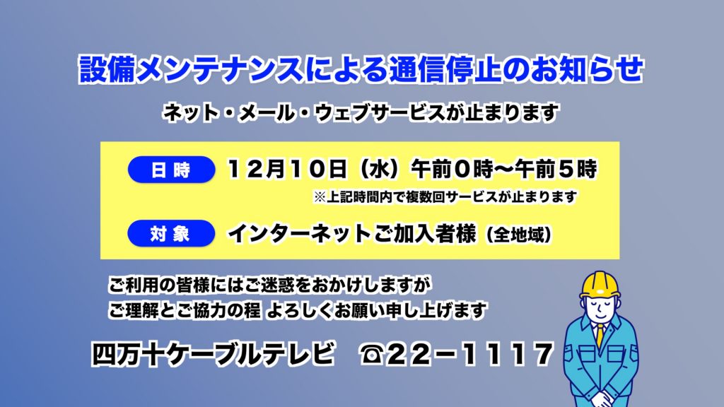 以下の日程においてインターネット設備のメンテナンス作業を実施させていただきます。