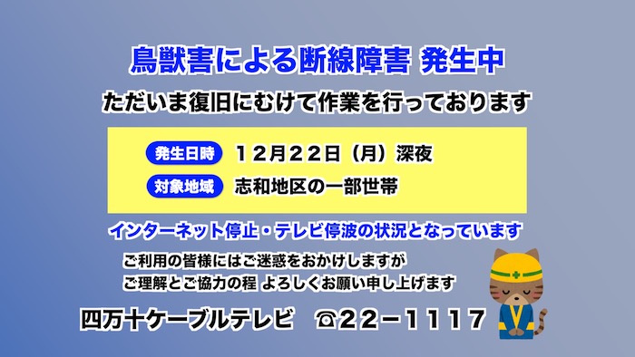 障害のお知らせ(志和地区の一部) 2025年12月23日 障害情報 by staff. 日頃はケーブルテレビをご利用いただきありがとうございます。 現在、志和地区の一部で鳥獣害による光ケーブルの断線障害が発生しております。 復旧に向けて作業を進めております。 ご利用中のお客様には大変ご迷惑をおかけてして申し訳ございません。 復旧まで、いましばらくお待ちください。 【障害情報】12/23 10:30 場所:志和地区の一部世帯 内容:通信停止・電波停波 (テレビ受信不可・ネット接続不可) 原因:鳥獣害による光ケーブル断線 発生:22日(月)の深夜 前の記事