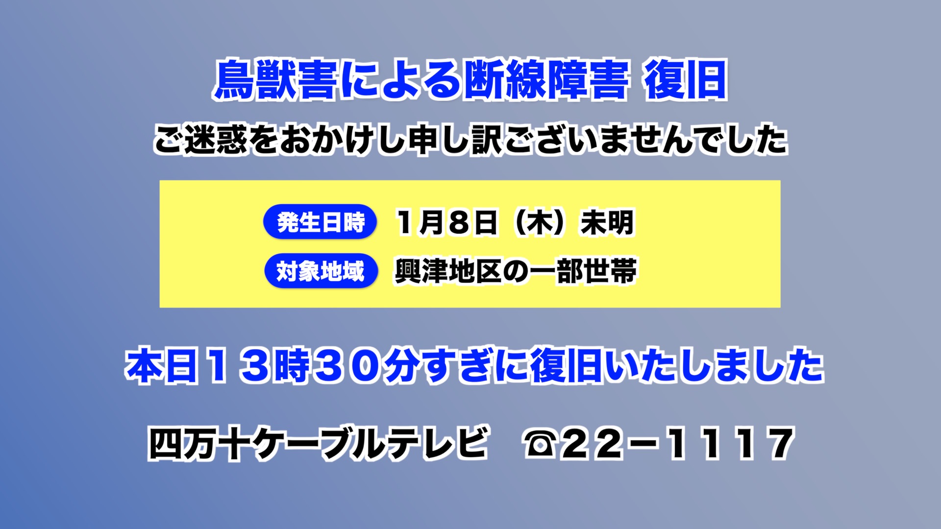 復旧のお知らせ(興津地域の一部世帯) 2026年1月8日 その他 by staff. ★復旧★ 【障害情報】1/8 13:40 8日(木)未明から発生しておりました、興津地区の鳥獣害被害による光ケーブル断線は本日13時30分過ぎに復旧しました。 ご迷惑をおかけし申し訳ございませんでした。 今後とも四万十ケーブルテレビをよろしくお願いいたします。 前の記事